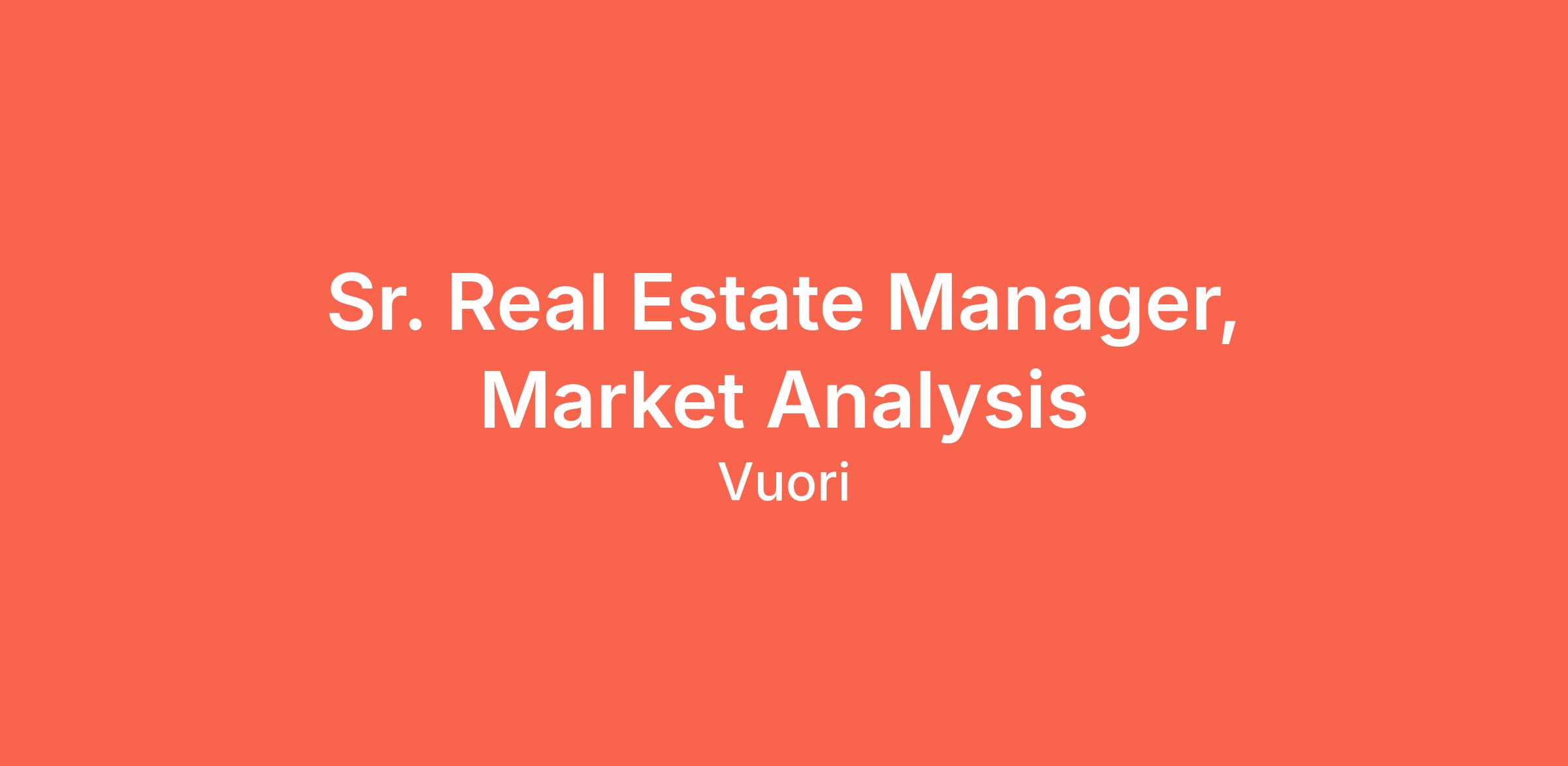 The Senior Real Estate Manager, Market Analysis supports Vuori’s retail expansion and existing store reinvestment efforts through detailed market analysis, financial modeling, and performance tracking. Reporting to the Vice President of Real Estate, this role focuses on producing accurate, actionable analysis that informs site selection, investment decisions, and ongoing portfolio performance.